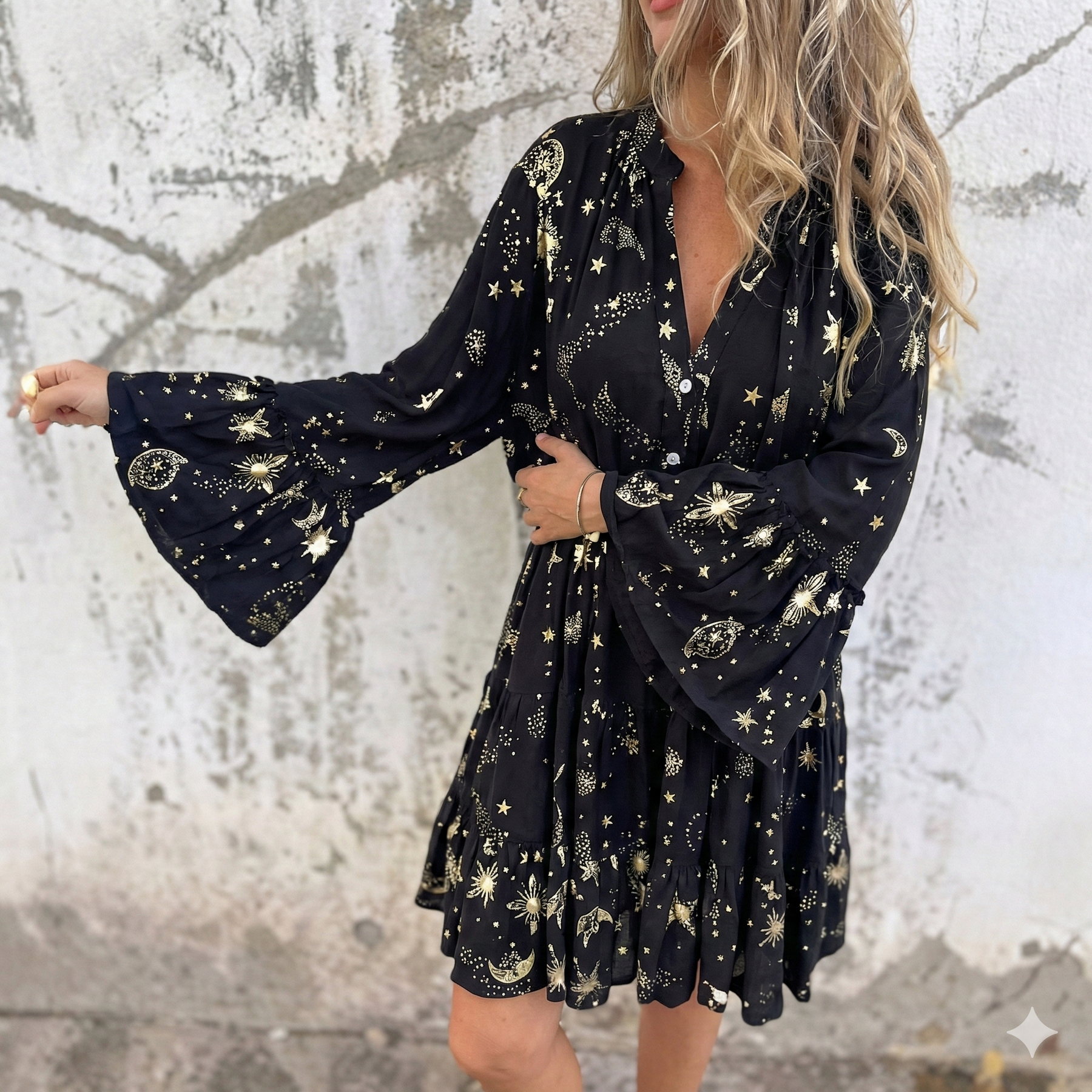 Step into effortless radiance with the Gayle Golden Hour Flow Dress, a flowing silhouette touched with delicate golden details.